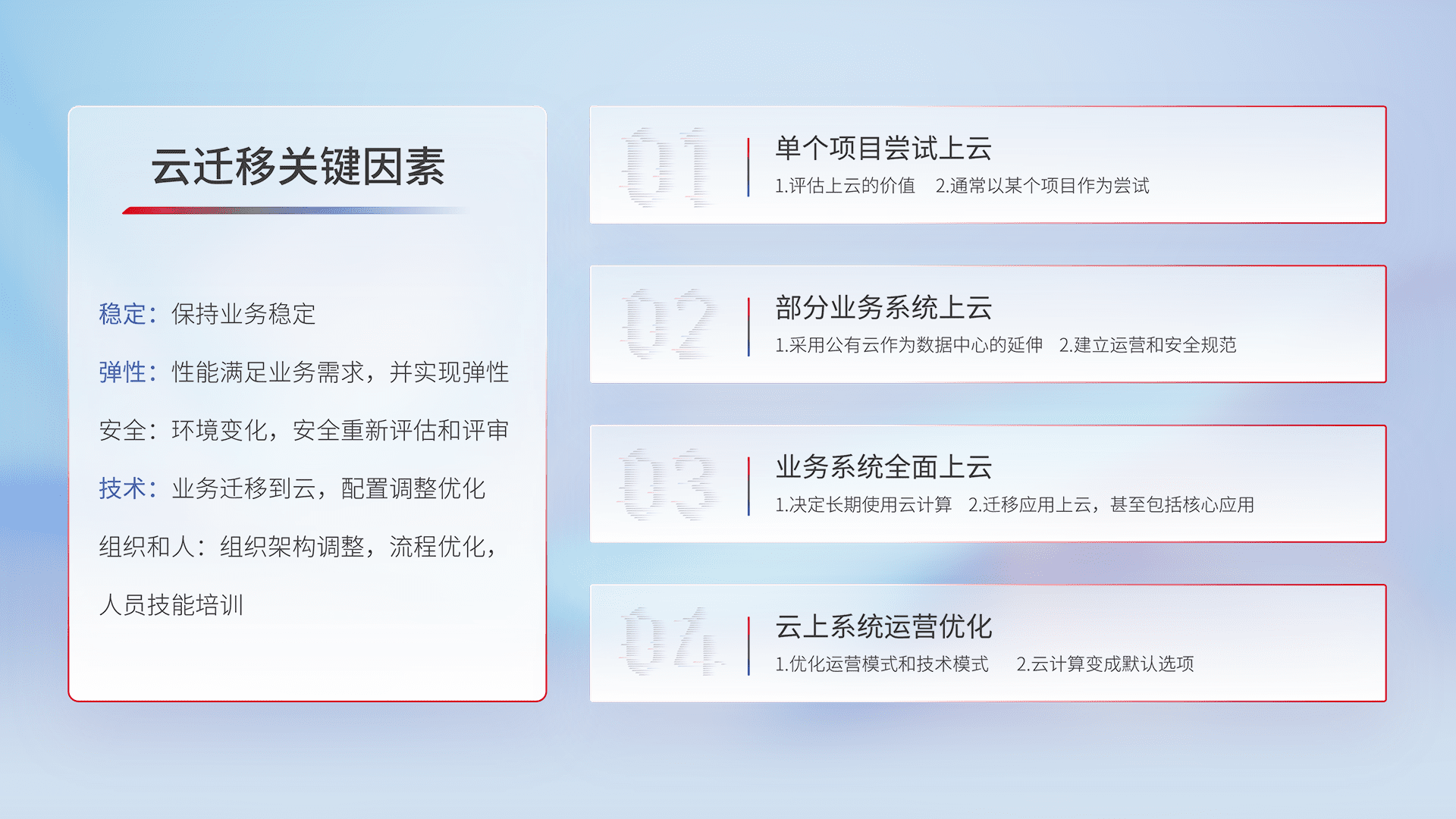 结合实际业务,,,从规划设计、、、云平台选型、、、、云原生改造、、、、数据迁移、、集成交付,,迁移全过程为客户识别最佳上云路径,,做好风险识别管理,,,设计网络架构、、、身份权限、、、安全审计合规、、操作审计、、日志审计、、监控告警策略、、、、多站点容灾设计等,,,对云上基础设施进行整体规划,,,,提升IT治理水平,,,以满足弹性、、高可用、、、、高性能的需求。。。
