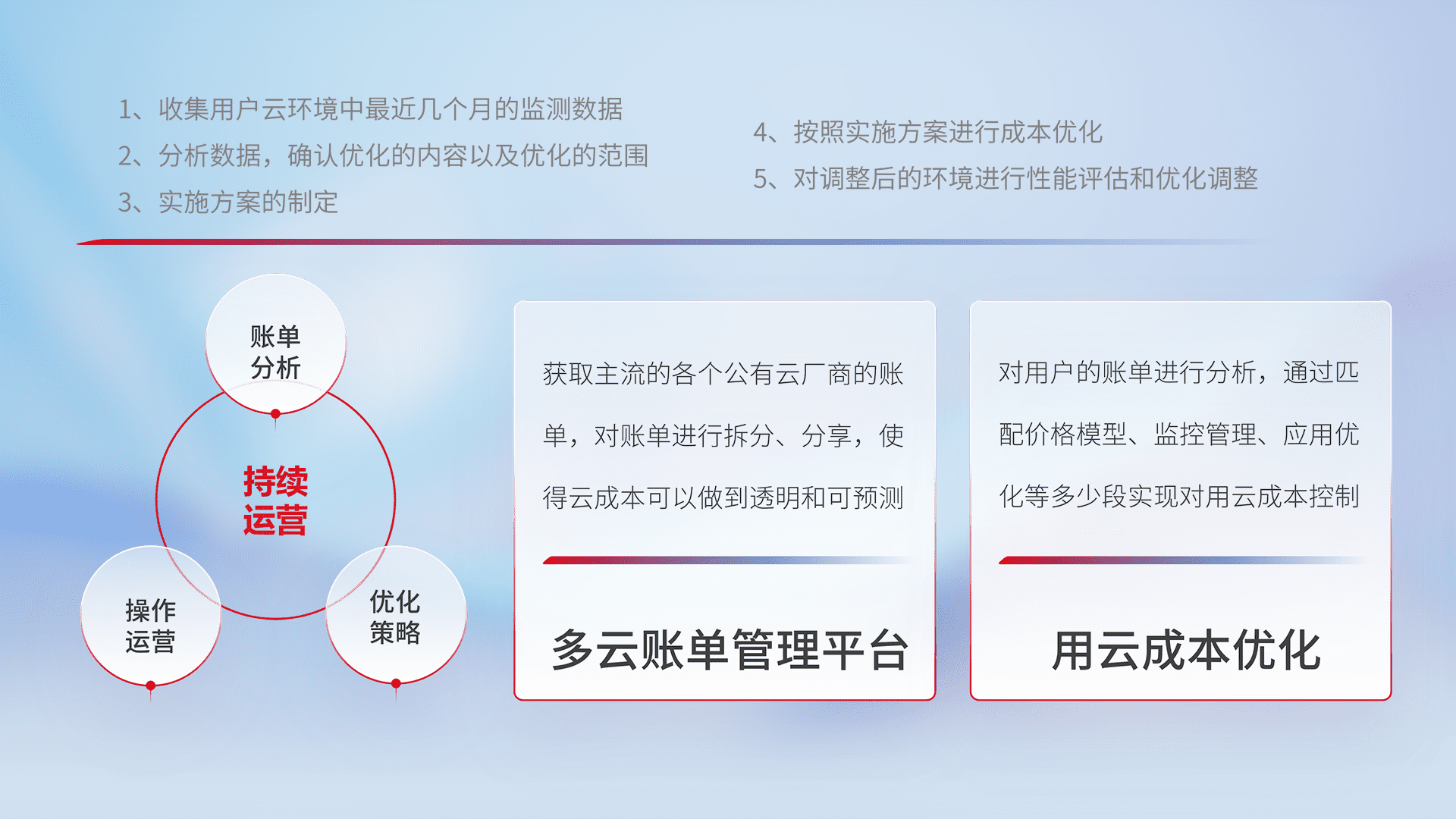 通过多云纳管,,,以统一的资源数据模型把客户的云资源进行抽象和封装,,进而实现对多云资源的统一操作,,,,保障云资源管理的可靠性、、、稳定性与可用性。。量身定制化运维内容,,,配置、、开发运维、、、、补丁管理、、、、备份、、、监控、、、认证和访问管理、、、、审计和日常巡检等,,,保障在用云过程中的可靠度,,,稳定度以及高可用率。。。